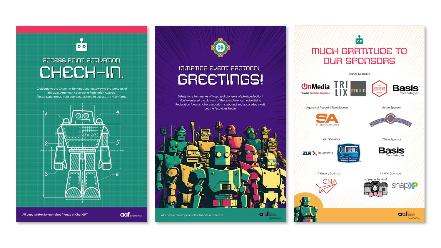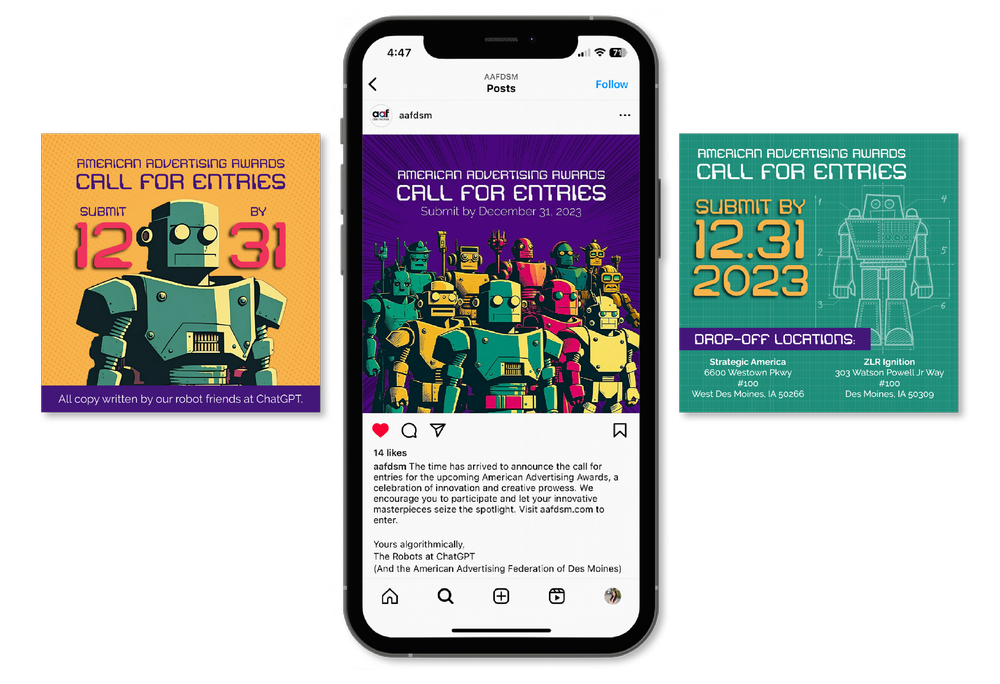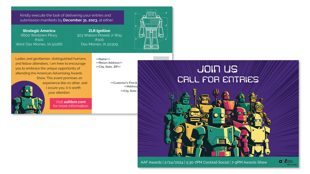 As the Agency of Record sponsor for the 2024 American Advertising Federation Awards for Des Moines, we conceptualized and executed a tongue-in-cheek theme that nods to the recent proliferation of AI.